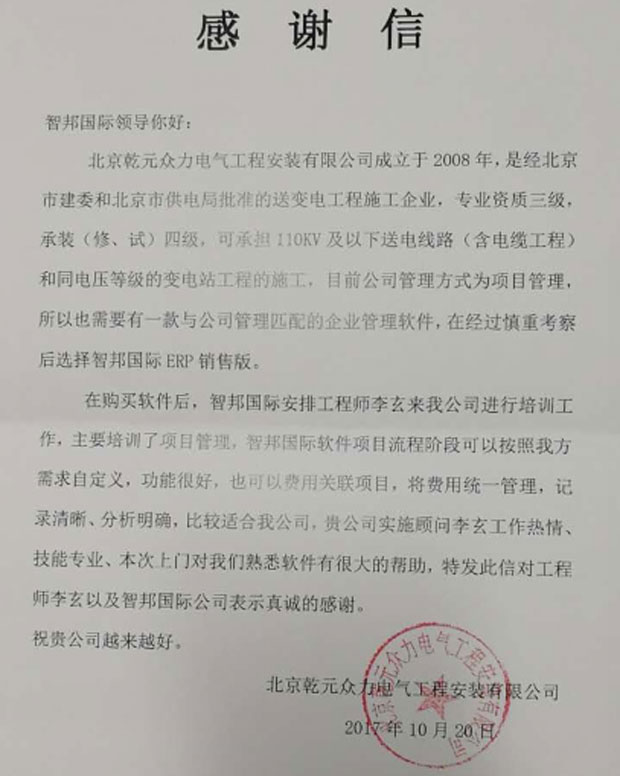 随着信息科技高速发展,企业管理已经演变成信息化管理,越来越多企业用信息化系统代替管理制度的监督与执行,从而提高工作效率,实现精细化管理。相信在智邦国际ERP系统的协助下,北京乾元众力电气工程安装有限公司定能打造规范化、系统化、自动化的运营体系,以新思维、新策略、新合作提供卓越品质的产品和服务,走可持续发展之路!