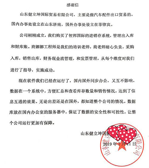 山东健立坤国际贸易有限公司智邦国际进销存系统感谢信