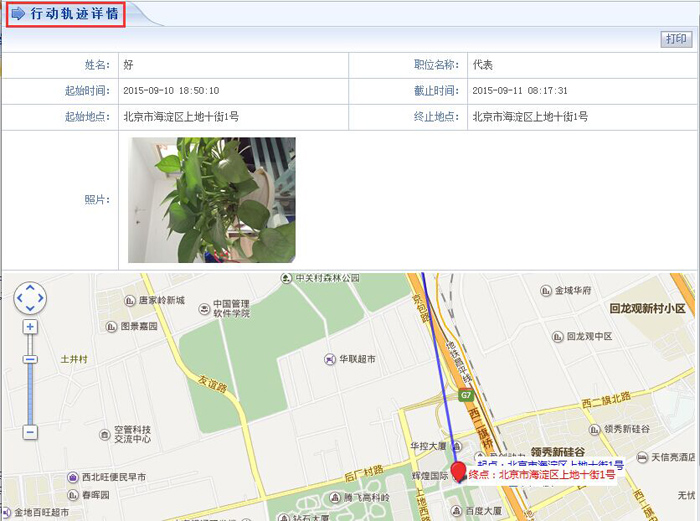 二、系统支持在pc端通过行动轨迹列表查看用户行动轨迹,便于跟踪和掌握用户行程。在行动轨迹列表可看到业务人员行动起始时间、起始地点、截止时间、终止地点等信息,通过行动轨迹详情可看到系统记录的用户轨迹信息、拍照信息等。帮助企业实现全方位一体化管理,为可持续发展助力。系统还会智能提示业务人员当前所在地周边客户的详细信息,帮助业务人员更好的完成工作任务,避免遗漏重要客户及机会,为业务人员提供全新、便捷、高效的移动办公模式。