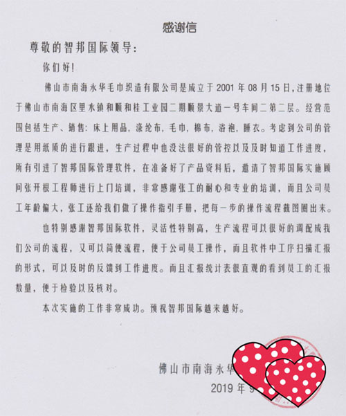 近期,佛山市南海永华毛巾织造有限公司正式签约智邦国际,希望通过智邦国际ERP系统的使用,规范企业业务流程,多终端即时登录助力企业管理层实时获取精准数据、智能审单提升产销效率与质量,从而全方位提高企业服务能力和市场竞争力。