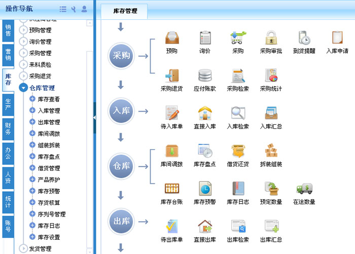 一、系统支持采购、退货、退料、废料、成品、调拨、盘点等多种入库方式,以及销售、调拨、采购退货、盘点等多种出库方式,满足企业日常出入库所需,数据线上实时呈现,自动留痕,透明化管理让库存状态一目了然。并且支持线上库间批量调货与精确调货,实现各仓库之间的科学调拨,达到产品的合理分配与精细管控。还可以自定义设置库存上下限数量,当库存数量超过上下限时,系统则会自动预警,防止超买超卖、库存积压等情况的发生,轻松解决各种库存问题。