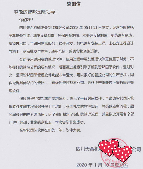 天合机械公司智邦国际机械行业ERP系统感谢信