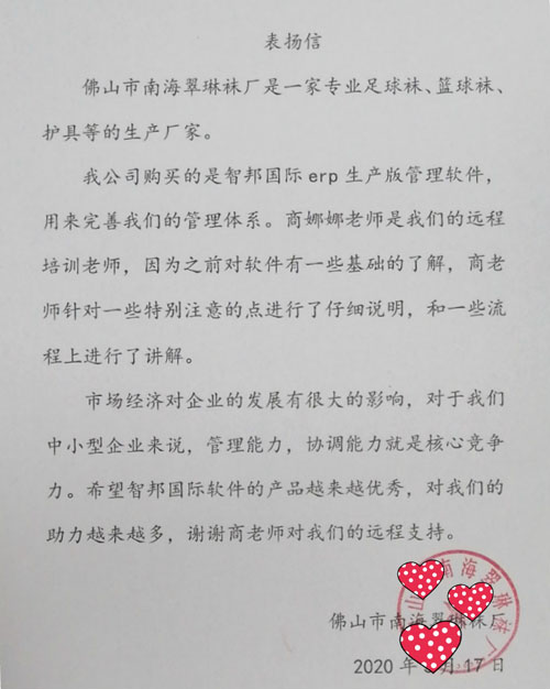 佛山市南海翠琳袜厂向智邦国际送感谢信