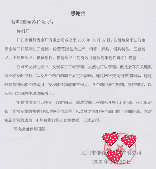 江门市健锋五金厂有限公司向智邦国际送感谢信