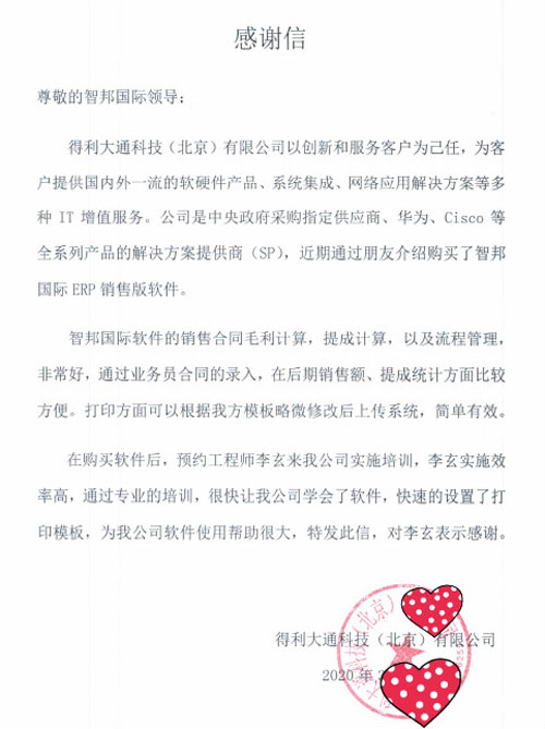 得利大通科技(北京)有限公司向智邦国际送感谢信