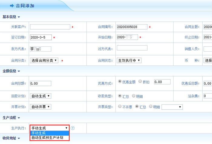 智邦国际ERP系统由合同手动、自动生成预生产计划
