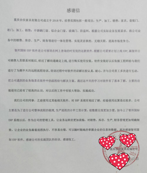 重庆合庆家具有限公司与智邦国际成功签约,希望通过智邦国际ERP系统的应用,可以科学化整合各个部门产生的所有数据信息,实现企业价值链各环节的一体化运转,信息实时共享,各环节智能互联,合理优化配置内部资源,提高企业的整体竞争优势。