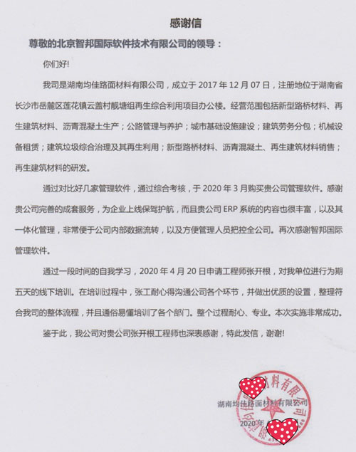 湖南均佳路面材料有限公司向智邦国际送感谢信
