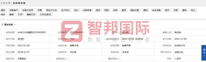 在智邦国际ERP系统中,合同可关联1个父合同和多个客户,可一键转设计、预购、采购、费用、预生产计划、生产派工、出库申请、开票、售后等环节,洽谈进展实时录入,合同信息可一键共享、复制、修改、删除、打印等,可一键发送线上通知,系统自动触发被通知人,消灭各环节协作沟通壁垒,提高企业运行效率。