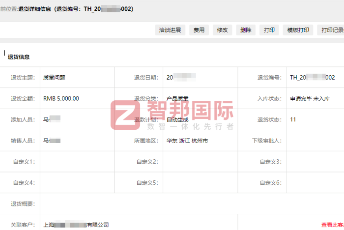 智邦一体化ERP天工系列退货详细信息(局部图)